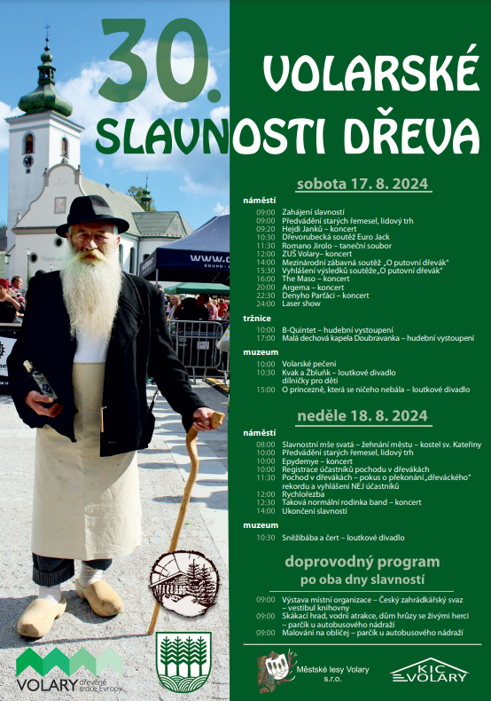 Třetí víkend v srpnu patří řemeslníkům, kapelám, pečení dobrot v peci, pohádkám a atrakcím pro děti i dospělé, pokořování rekordů, soutěžím nejen dřevorubeckým, dobrému jídlu a pití…prostě Volarským slavnostem dřeva, tentokrát jubilejním, třicátým!